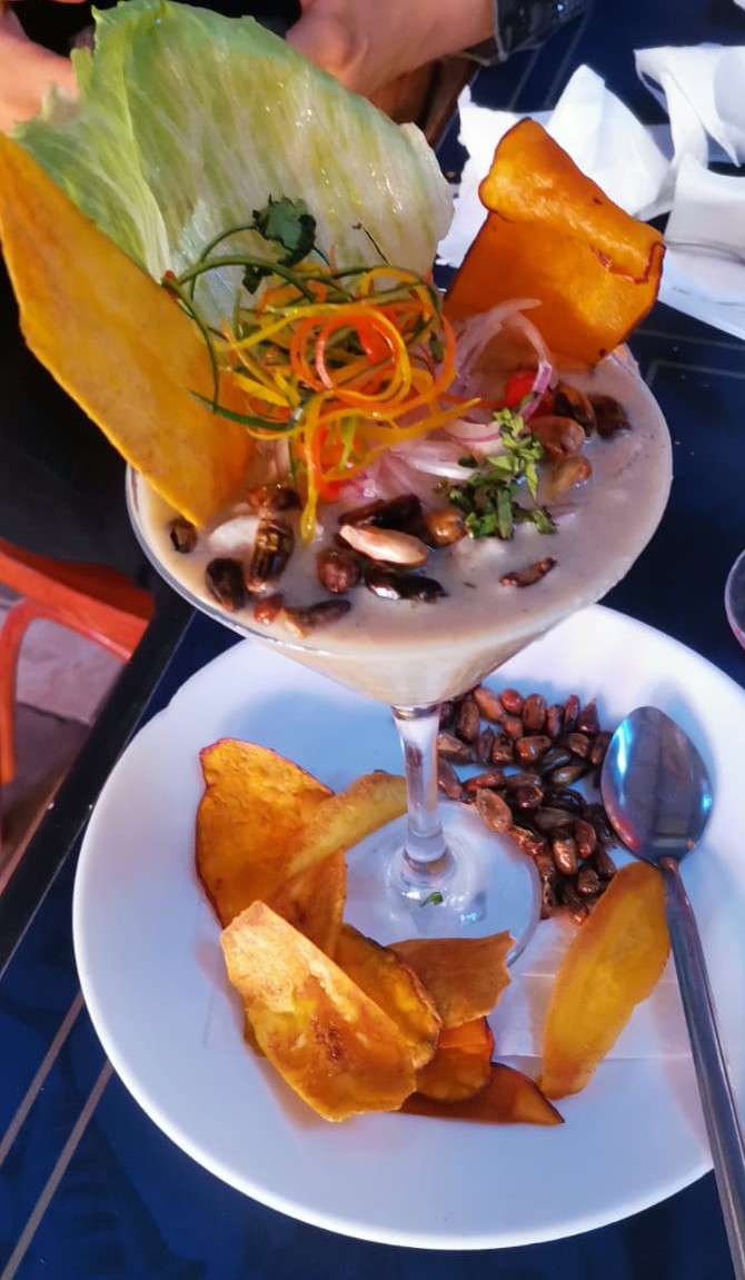 Jugo de leche de tigre preparado con ajo, cilantro, apio, merquen, leche gloria, rocotto, morron), ceviche de pescado, servido en una copa decorado con platano berraganette frito, calcha maiz.